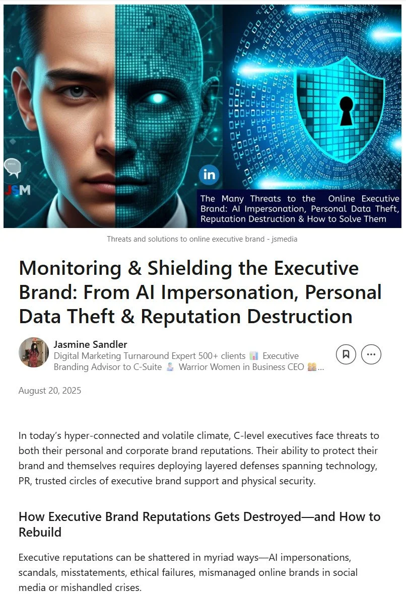 Led by Jasmine Sandler — global keynote speaker and executive-team trainer in LinkedIn marketing and executive brand-building — JSMedia has helped thousands of leaders expand their impact inside and outside their organizations, leading to paid board opportunities, compensation growth, investor interest, promotions, media coverage, and community leadership.